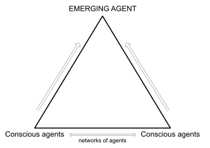 Hoffman and Prakash (Hoffman and Prakash 2014, p.112) propose that consciousness is fundamental, and the world is made of conscious agents - with space-time acting as the interface between agents. Conscious agents include you and me – beings that interact in this projected reality. From this perspective, the world is not objectively true, but rather, an ‘interface’ that conscious agents use to interact with each other. Hence, the world is not made of matter, but of relations between conscious agents, which gives rise to new agents. Emergent agents are derived from the interactions of agents, which gives rise to new properties, not within the original agents but intelligible to them. Hoffman describes these agents as either combining to form more complex agents with more complex experiences, or fusing into simpler agents with entirely new sets of experience (Hoffman, Prakash, & Prentner, 2023, p.1).